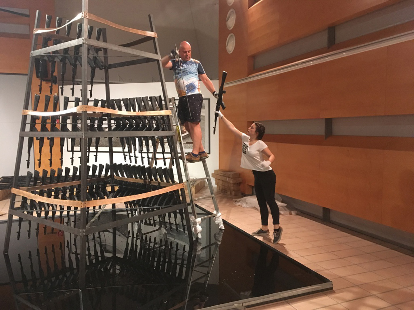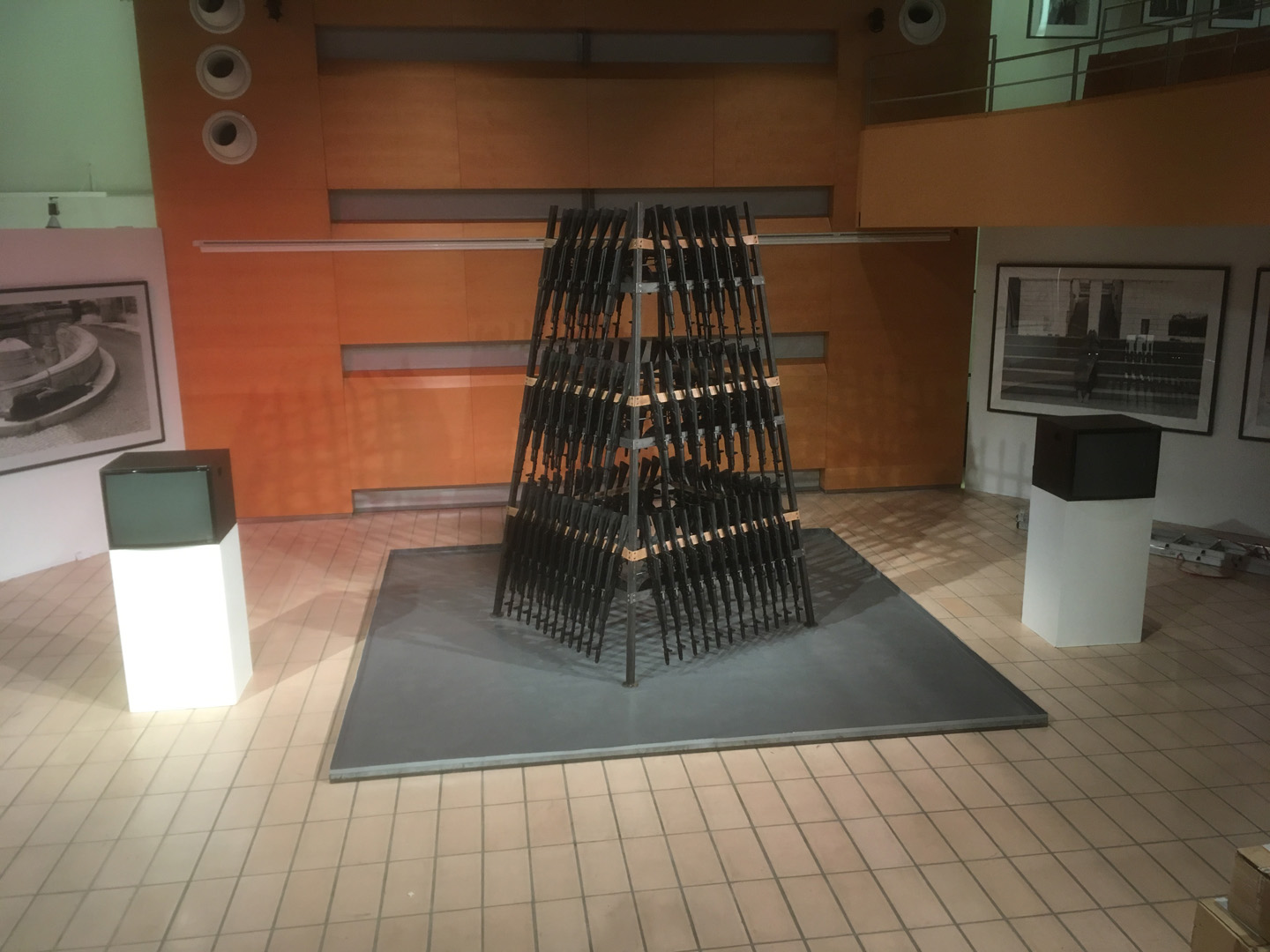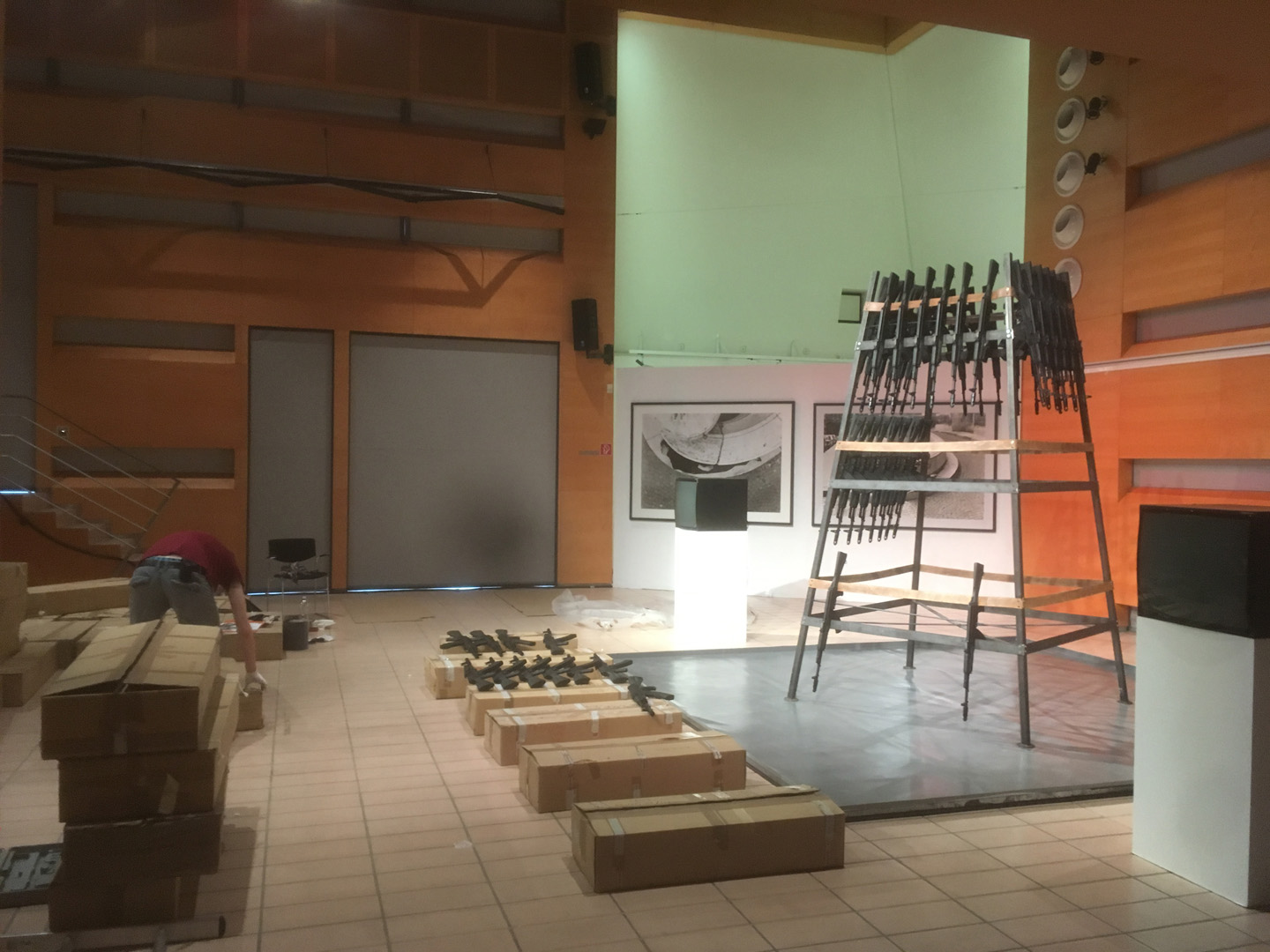 Rauminstallation, deren Hauptaugenmerk aus 106 Kalashnikov-Gewehren, einer